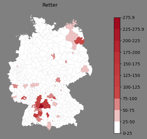 Relative Verteilung des Namens Retter (1996)Direkt zur Karte Die Farbskala zeigt die Anzahl von "Retter" bezogen auf je 1 Million Einträge. |