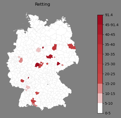 Relative Verteilung des Namens Retting (1996)Direkt zur Karte Die Farbskala zeigt die Anzahl von "Retting" bezogen auf je 1 Million Einträge. |