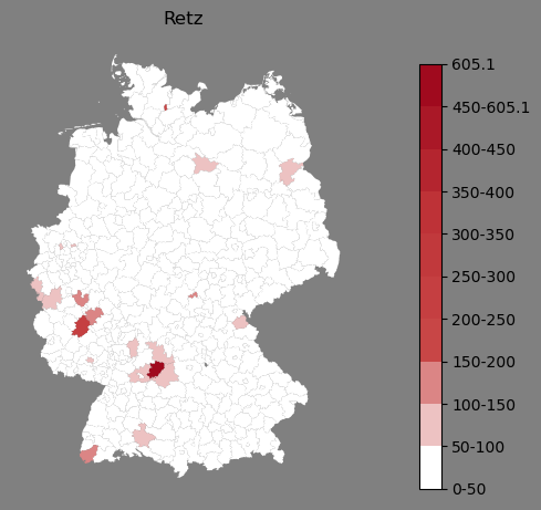 Relative Verteilung des Namens Retz (1996)Direkt zur Karte Die Farbskala zeigt die Anzahl von "Retz" bezogen auf je 1 Million Einträge. |