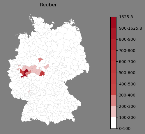 Relative Verteilung des Namens Reuber (1996)Direkt zur Karte Die Farbskala zeigt die Anzahl von "Reuber" bezogen auf je 1 Million Einträge. |
