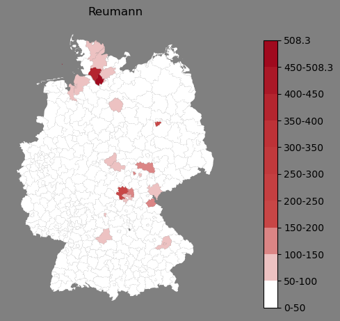 Relative Verteilung des Namens Reumann (1996)Direkt zur Karte Die Farbskala zeigt die Anzahl von "Reumann" bezogen auf je 1 Million Einträge. |