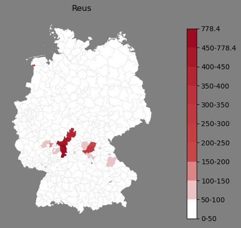 Absolute Verteilung des Namens Reus (1890)Direkt zur Karte Absolute Verteilung des Namens "Reus" um 1890 im damaligen Deutschen Reich Sie können die Karte innerhalb des Fensters zoomen und verschieben. |