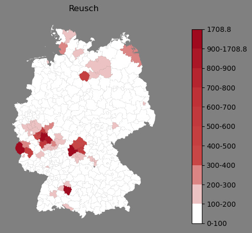 Absolute Verteilung des Namens Reusch (1890)Direkt zur Karte Absolute Verteilung des Namens "Reusch" um 1890 im damaligen Deutschen Reich Sie können die Karte innerhalb des Fensters zoomen und verschieben. |