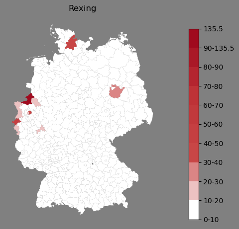 Relative Verteilung des Namens Rexing (1996)Direkt zur Karte Die Farbskala zeigt die Anzahl von "Rexing" bezogen auf je 1 Million Einträge. |