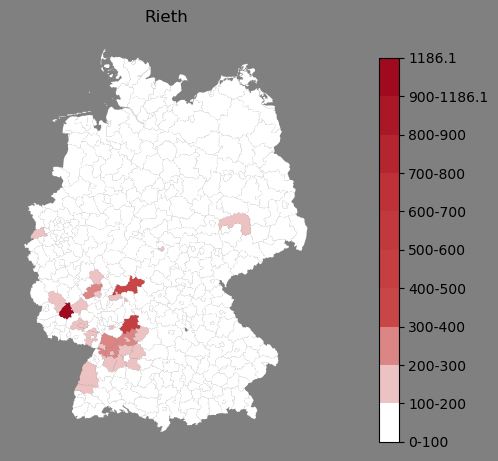 Relative Verteilung des Namens Rieth (1996)Direkt zur Karte Die Farbskala zeigt die Anzahl von "Rieth" bezogen auf je 1 Million Einträge. |
