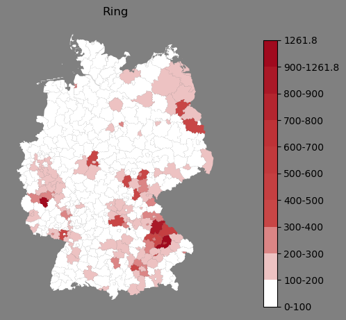 Relative Verteilung des Namens Ring (1996)Direkt zur Karte Die Farbskala zeigt die Anzahl von "Ring" bezogen auf je 1 Million Einträge. |