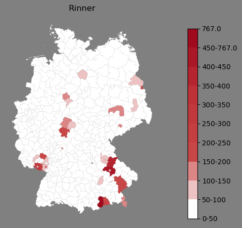 Relative Verteilung des Namens Rinner (1996)Direkt zur Karte Die Farbskala zeigt die Anzahl von "Rinner" bezogen auf je 1 Million Einträge. |