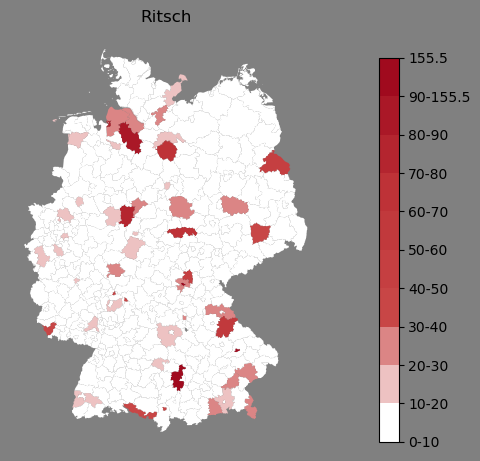 Relative Verteilung des Namens Ritsch (1996)Direkt zur Karte Die Farbskala zeigt die Anzahl von "Ritsch" bezogen auf je 1 Million Einträge. |