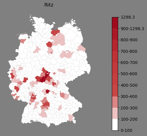 Absolute Verteilung des Namens Ritz (1890)Direkt zur Karte Absolute Verteilung des Namens "Ritz" um 1890 im damaligen Deutschen Reich Sie können die Karte innerhalb des Fensters zoomen und verschieben. |