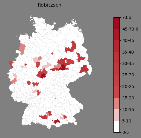 Relative Verteilung des Namens Robitzsch (1996)Direkt zur Karte Die Farbskala zeigt die Anzahl von "Robitzsch" bezogen auf je 1 Million Einträge. |