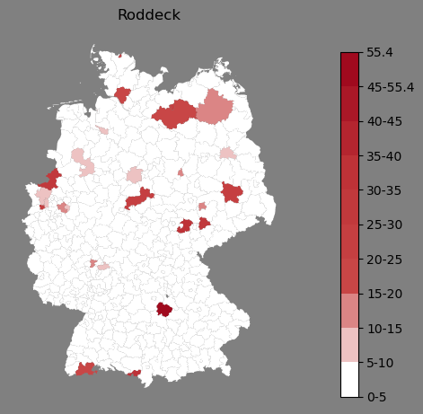 Relative Verteilung des Namens Roddeck (1996)Direkt zur Karte Die Farbskala zeigt die Anzahl von "Roddeck" bezogen auf je 1 Million Einträge. |