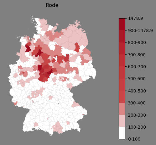 Relative Verteilung des Namens Rode (1996)Direkt zur Karte Die Farbskala zeigt die Anzahl von "Rode" bezogen auf je 1 Million Einträge. |