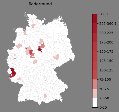Relative Verteilung des Namens Rodermund (1996)Direkt zur Karte Die Farbskala zeigt die Anzahl von "Rodermund" bezogen auf je 1 Million Einträge. |