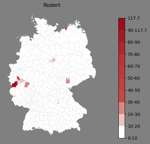 Relative Verteilung des Namens Rodert (1996)Direkt zur Karte Die Farbskala zeigt die Anzahl von "Rodert" bezogen auf je 1 Million Einträge. |