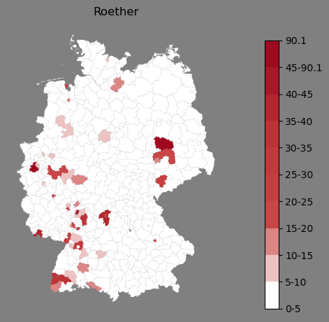 Relative Verteilung des Namens Roether (1996)Direkt zur Karte Die Farbskala zeigt die Anzahl von "Roether" bezogen auf je 1 Million Einträge. |