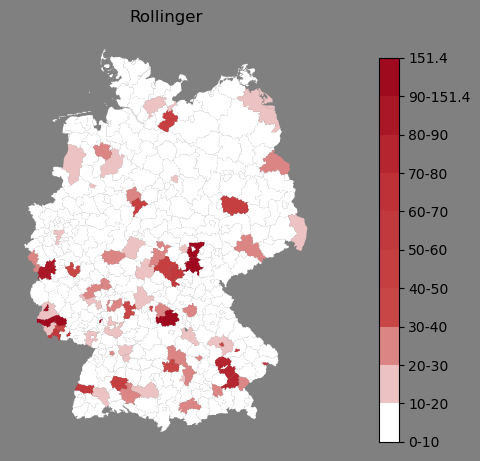 Absolute Verteilung des Namens Rollinger (1890)Direkt zur Karte Absolute Verteilung des Namens "Rollinger" um 1890 im damaligen Deutschen Reich Sie können die Karte innerhalb des Fensters zoomen und verschieben. |