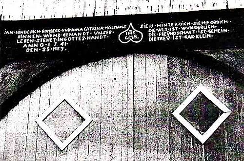 - JAN HINDERICH ROMBECK UND ANNA CATRINA HALMANS / BINNEN WIEHR GENANDT UNSER / LEBEN STEHET IN GOTTES HANDT / ANNO 1741 / DEN 25 MEY / IHS – CMB / SIEH HINTER DICH SIEH FOR DICH / DIE WELT IST WUNDERLICH / DIE FREUNDSCHAFT IST GEMEIN / DIE TREU IST GAR KLEIN