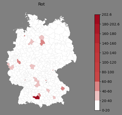 Relative Verteilung des Namens Rot (1996)Direkt zur Karte Die Farbskala zeigt die Anzahl von "Rot" bezogen auf je 1 Million Einträge. |