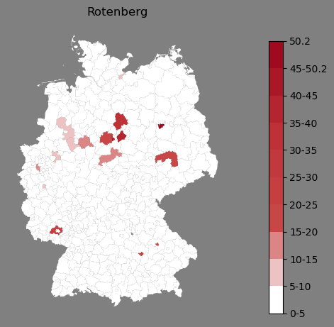 Relative Verteilung des Namens Rotenberg (1996)Direkt zur Karte Die Farbskala zeigt die Anzahl von "Rotenberg" bezogen auf je 1 Million Einträge. |