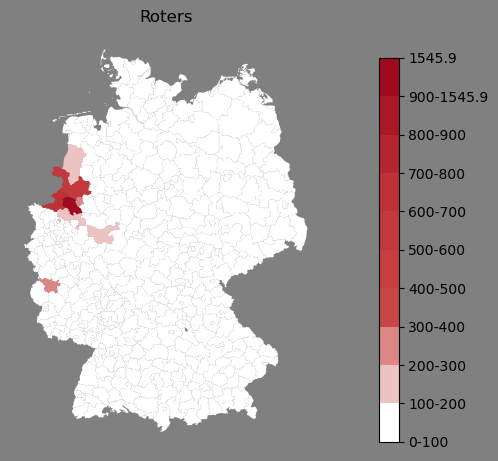 Relative Verteilung des Namens Roters (1996)Direkt zur Karte Die Farbskala zeigt die Anzahl von "Roters" bezogen auf je 1 Million Einträge. |