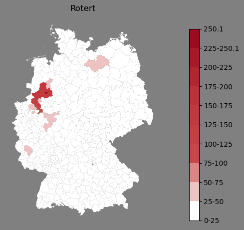 Relative Verteilung des Namens Rotert (1996)Direkt zur Karte Die Farbskala zeigt die Anzahl von "Rotert" bezogen auf je 1 Million Einträge. |
