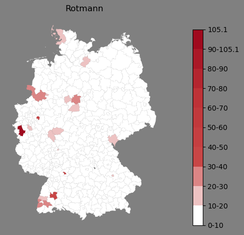 Relative Verteilung des Namens Rotmann (1996)Direkt zur Karte Die Farbskala zeigt die Anzahl von "Rotmann" bezogen auf je 1 Million Einträge. |