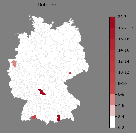 Relative Verteilung des Namens Rotstein (1996)Direkt zur Karte Die Farbskala zeigt die Anzahl von "Rotstein" bezogen auf je 1 Million Einträge. |