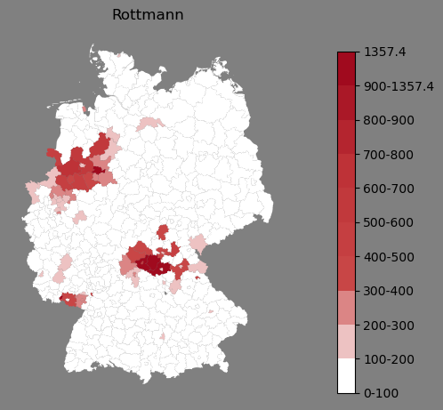 Absolute Verteilung des Namens Rottmann (1890)Direkt zur Karte Absolute Verteilung des Namens "Rottmann" um 1890 im damaligen Deutschen Reich Sie können die Karte innerhalb des Fensters zoomen und verschieben. |