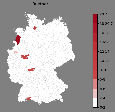 Relative Verteilung des Namens Ruether (1996)Direkt zur Karte Die Farbskala zeigt die Anzahl von "Ruether" bezogen auf je 1 Million Einträge. |