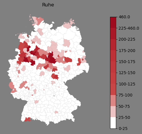 Relative Verteilung des Namens Ruhe (1996)Direkt zur Karte Die Farbskala zeigt die Anzahl von "Ruhe" bezogen auf je 1 Million Einträge. |