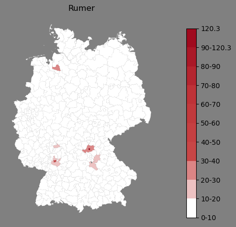 Relative Verteilung des Namens Rumer (1996)Direkt zur Karte Die Farbskala zeigt die Anzahl von "Rumer" bezogen auf je 1 Million Einträge. |
