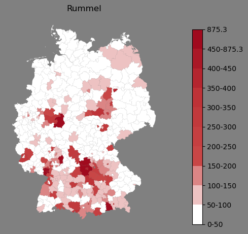 Relative Verteilung des Namens Rummel (1996)Direkt zur Karte Die Farbskala zeigt die Anzahl von "Rummel" bezogen auf je 1 Million Einträge. |