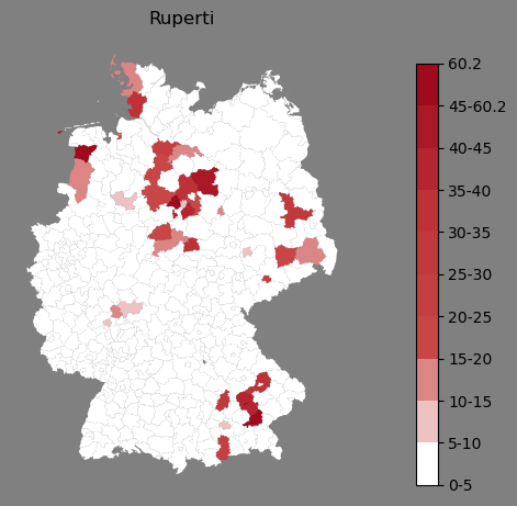 Relative Verteilung des Namens Ruperti (1996)Direkt zur Karte Die Farbskala zeigt die Anzahl von "Ruperti" bezogen auf je 1 Million Einträge. |