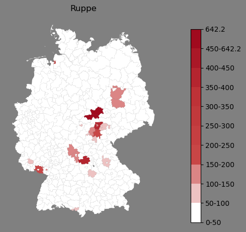 Relative Verteilung des Namens Ruppe (1996)Direkt zur Karte Die Farbskala zeigt die Anzahl von "Ruppe" bezogen auf je 1 Million Einträge. |