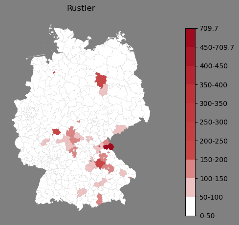 Relative Verteilung des Namens Rustler (1996)Direkt zur Karte Die Farbskala zeigt die Anzahl von "Rustler" bezogen auf je 1 Million Einträge. |