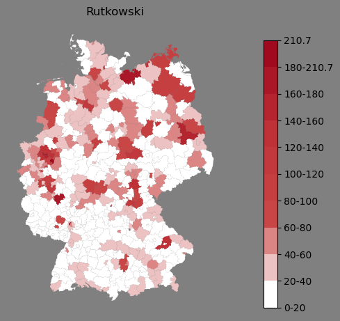Relative Verteilung des Namens Rutkowski (1996)Direkt zur Karte Die Farbskala zeigt die Anzahl von "Rutkowski" bezogen auf je 1 Million Einträge. |