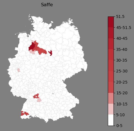 Relative Verteilung des Namens Saffe (1996)Direkt zur Karte Die Farbskala zeigt die Anzahl von "Saffe" bezogen auf je 1 Million Einträge. |