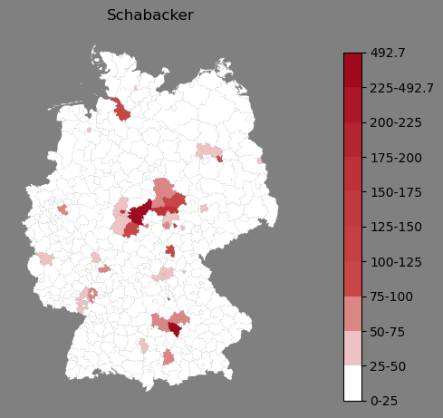 Relative Verteilung des Namens Schabacker (1996)Direkt zur Karte Die Farbskala zeigt die Anzahl von "Schabacker" bezogen auf je 1 Million Einträge. |