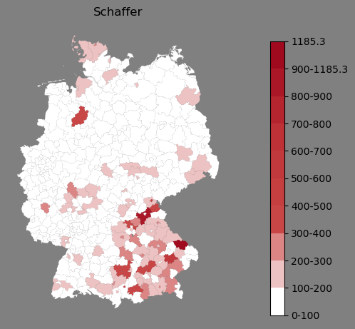 Relative Verteilung des Namens Schaffer (1996)Direkt zur Karte Die Farbskala zeigt die Anzahl von "Schaffer" bezogen auf je 1 Million Einträge. |