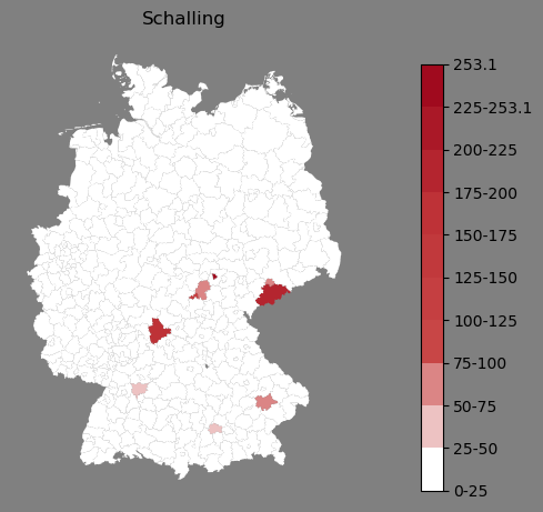 Relative Verteilung des Namens Schalling (1996)Direkt zur Karte Die Farbskala zeigt die Anzahl von "Schalling" bezogen auf je 1 Million Einträge. |