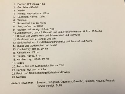 - Mehrere große und kleine Höfe, am Südufer der Gilge, 14 km nordwestlich von Tilsit, 1939: 144 Einwohner, mit großem Sägewerk an der Sandbank zwischen Gilge und Ruß[2]