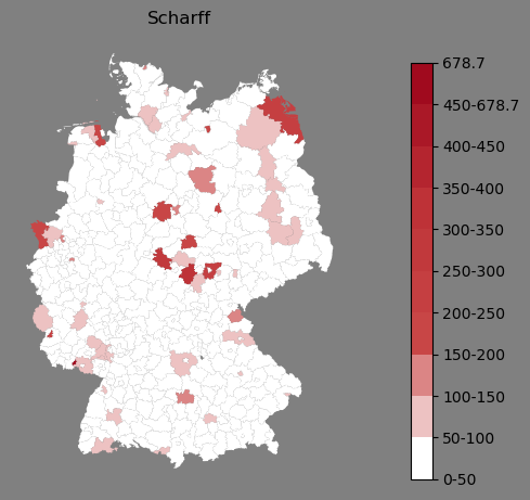 Relative Verteilung des Namens Scharff (1996)Direkt zur Karte Die Farbskala zeigt die Anzahl von "Scharff" bezogen auf je 1 Million Einträge. |