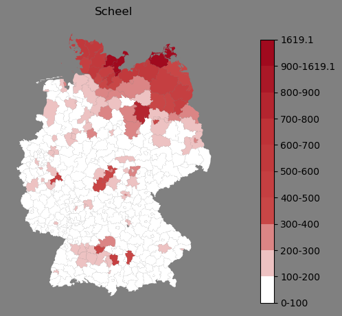 Relative Verteilung des Namens Scheel (1996)Direkt zur Karte Die Farbskala zeigt die Anzahl von "Scheel" bezogen auf je 1 Million Einträge. |