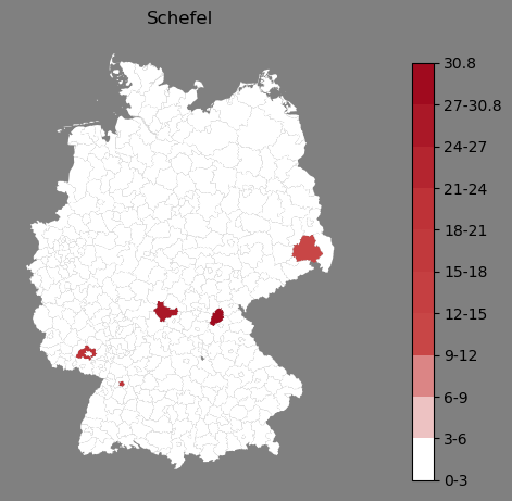 Relative Verteilung des Namens Schefel (1996)Direkt zur Karte Die Farbskala zeigt die Anzahl von "Schefel" bezogen auf je 1 Million Einträge. |
