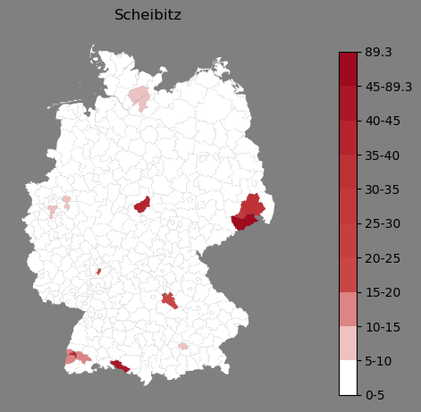 Relative Verteilung des Namens Scheibitz (1996)Direkt zur Karte Die Farbskala zeigt die Anzahl von "Scheibitz" bezogen auf je 1 Million Einträge. |