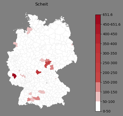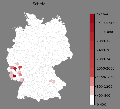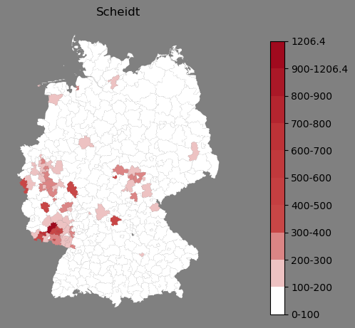 Relative Verteilung des Namens Scheide (1996)Direkt zur Karte Die Farbskala zeigt die Anzahl von "Scheide" bezogen auf je 1 Million Einträge. |