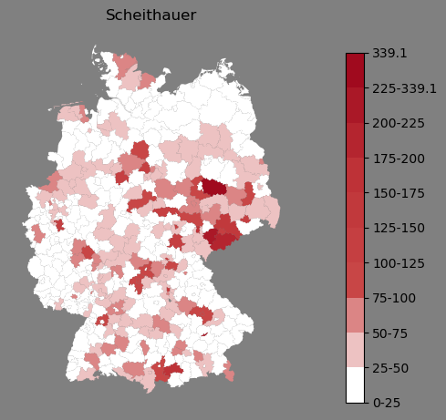 Relative Verteilung des Namens Scheithauer (1996)Direkt zur Karte Die Farbskala zeigt die Anzahl von "Scheithauer" bezogen auf je 1 Million Einträge. |