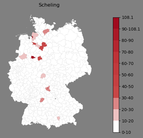 Relative Verteilung des Namens Scheling (1996)Direkt zur Karte Die Farbskala zeigt die Anzahl von "Scheling" bezogen auf je 1 Million Einträge. |