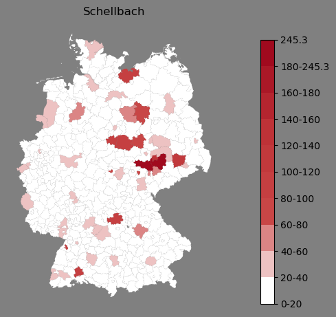 Relative Verteilung des Namens Schellbach (1996)Direkt zur Karte Die Farbskala zeigt die Anzahl von "Schellbach" bezogen auf je 1 Million Einträge. |