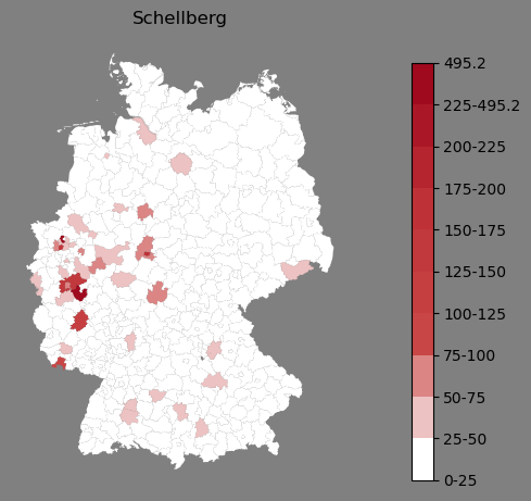 Relative Verteilung des Namens Schellberg (1996)Direkt zur Karte Die Farbskala zeigt die Anzahl von "Schellberg" bezogen auf je 1 Million Einträge. |